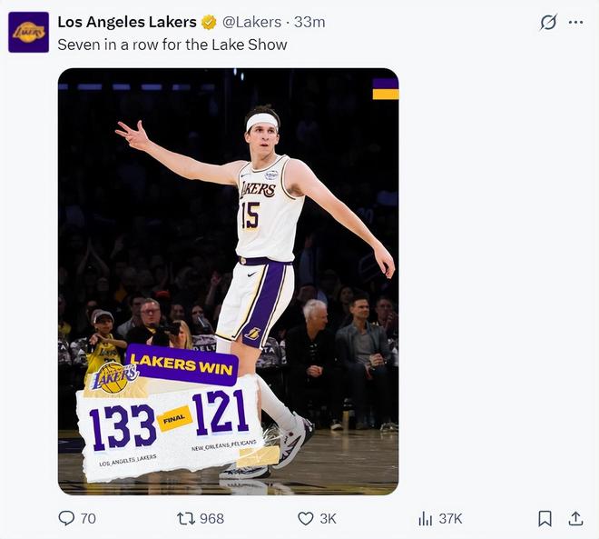 里夫斯背靠背两场得92分,2007年科比以来湖人队首人